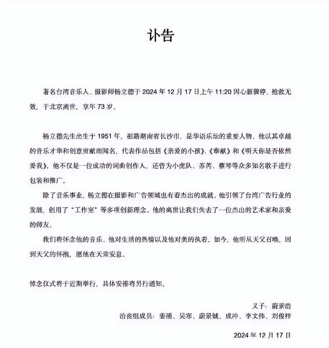 2024年12月17日,杨立德的义子蔚景浩,朋友姜通、吴寒等发布讣告,沉痛地宣布杨立德辞世。